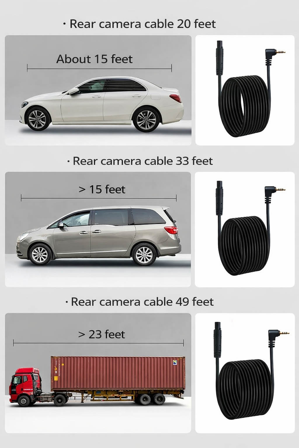 Three different rear camera cable lengths are available, up to approximately 49ft, making it suitable for vehicles of various sizes. Choose the appropriate rear camera length based on your car's dimensions. If you need a 33ft or 49ft rearview camera, please contact us for availability.
